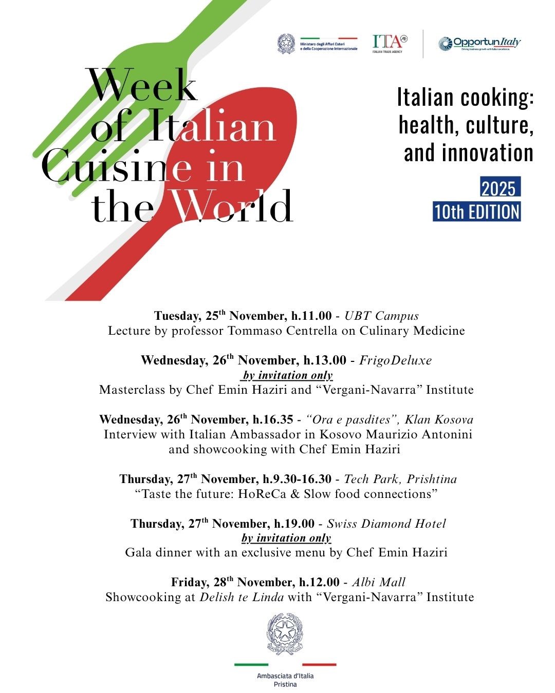 Si darà il via alle attività il 25 novembre con un momento formativo dedicato al tema della rassegna, attraverso una lezione dedicata alla Medicina Culinaria presso l’Università UBT di Pristina, a cura del Professor Tommaso Centrella dell’Istituto Vergani Navarra, unendo le conoscenze mediche e nutrizionali con la gastronomia, focalizzandosi sulle proprietà benefiche degli ingredienti principe della cucina italiana.
