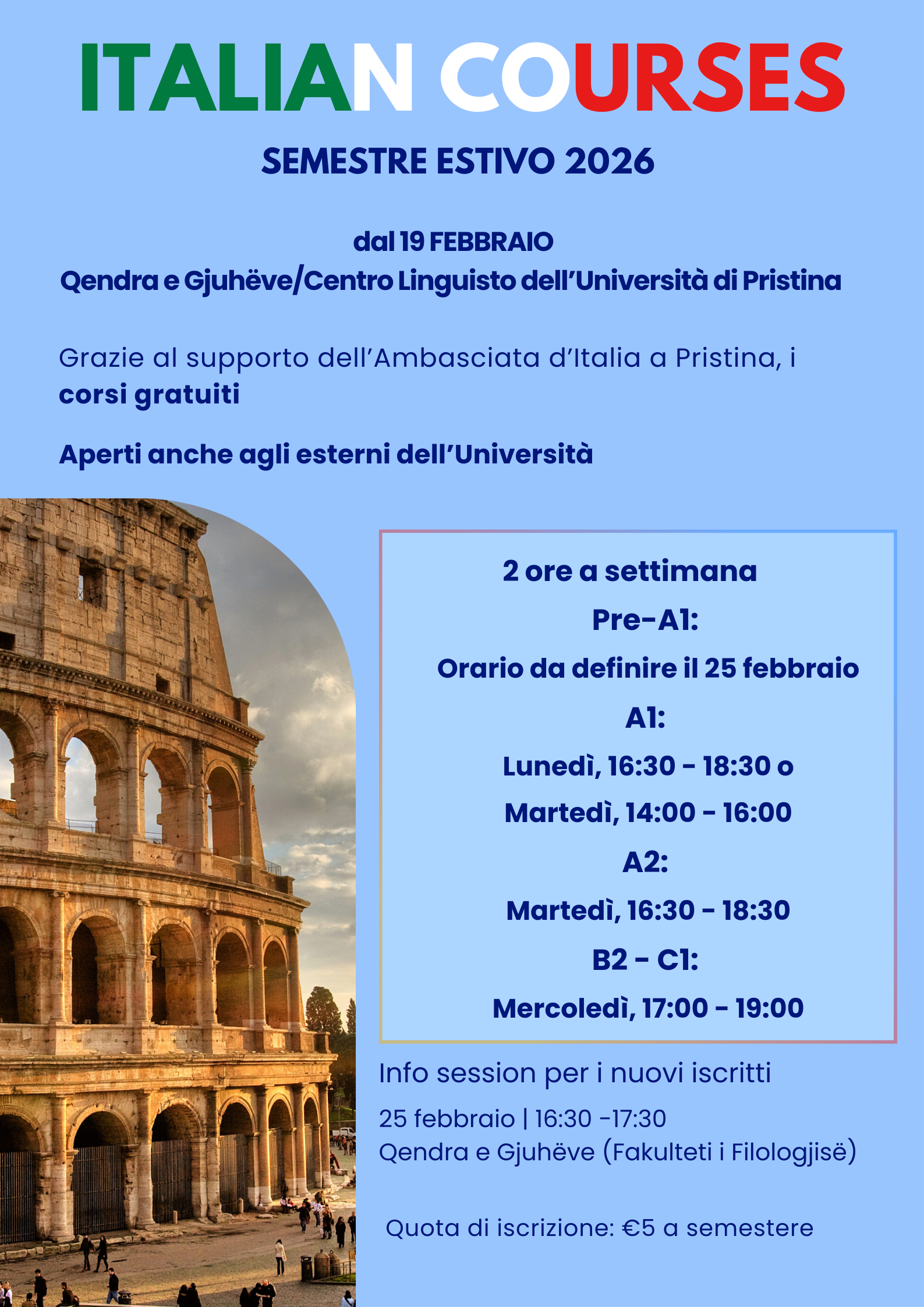 Më 19 shkurt 2026 rifillojnë kurset e gjuhës italiane në Qendrën e Gjuhëve të Universitetit të Prishtinës, të hapura edhe për persona që nuk janë pjesë e universitetit. Nga pjesëmarrësit kërkohet ndjekje e rregullt dhe angazhim i vazhdueshëm në studimin individual.